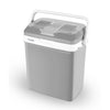 Praktikus, hordozható hűtőtáska 18 literes űrtartalommal, melegítési funkcióval. Autós csatlakozón keresztül tölthető.